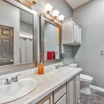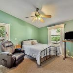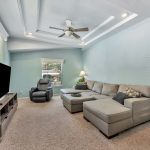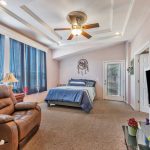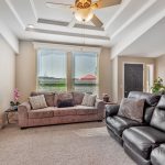 Tray ceilings with recessed lighting and ceiling fans elevate the style and comfort in the primary suite, living room, and family room. The primary suite is a true retreat with a sitting area, vaulted ceiling, large step-in closet, and outdoor access. The luxurious en-suite bath includes dual sinks and mirrors, a jetted soaking tub, and a separate stall shower.